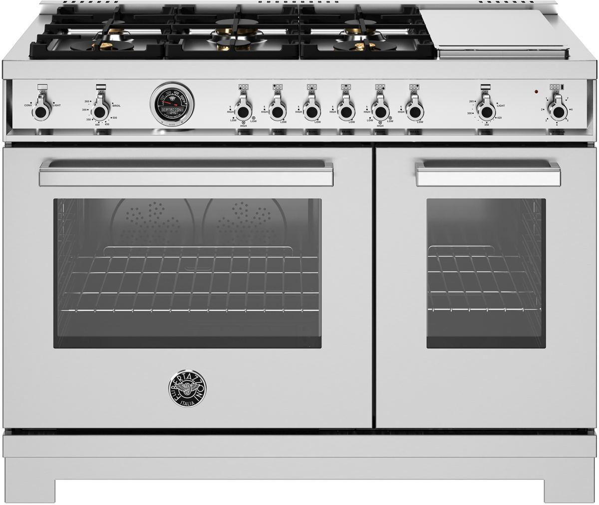 The high-efficiency maintop with 6 brass burners and electric griddle features 2 dual ring 19,000 BTU power-burners that boil water in under 6 minutes (best in class), and 4 additional MonoBloc burners of variable size and power to suit every style of cooking, with delicate simmer at 750 BTUs. The stainless steel griddle with integrated cover provides additional cooking options.