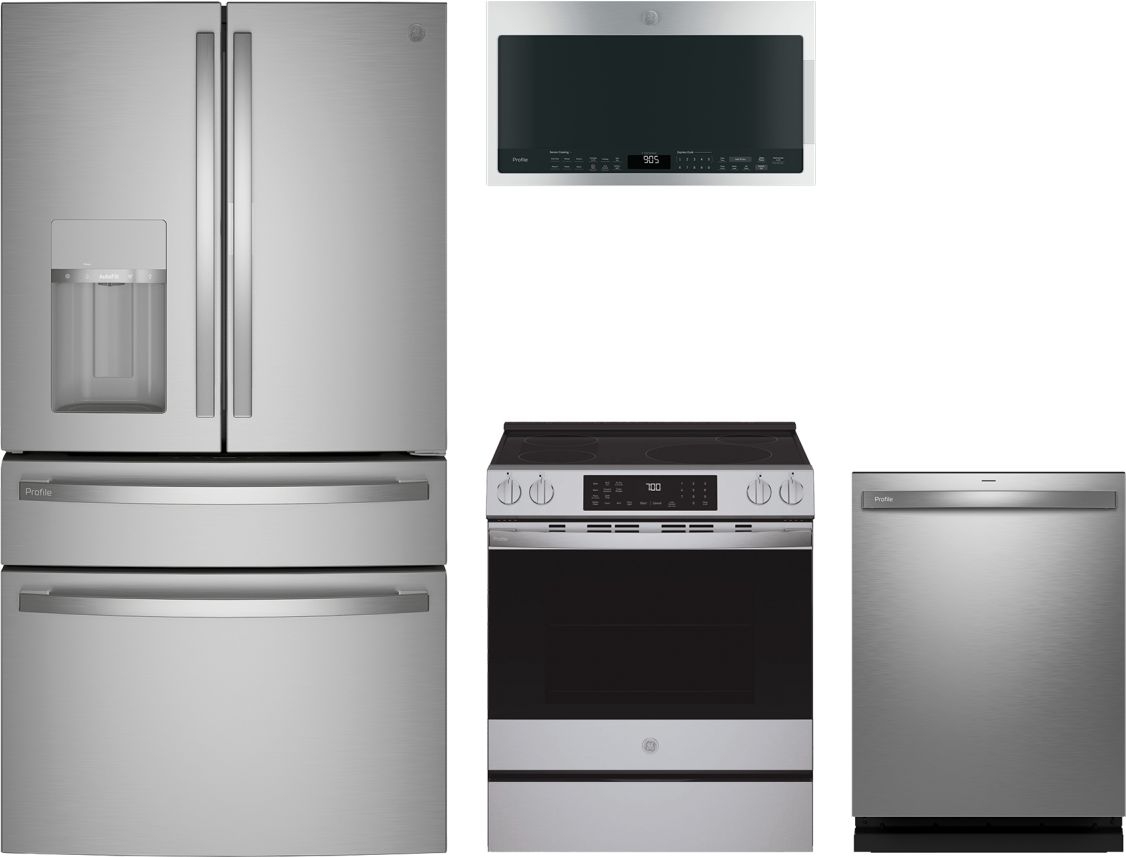 GE Profile™ 4 Piece Stainless Steel Kitchen Package with a side-by-side refrigerator, slide in induction range, built in dishwasher and over the range microwaveRead More