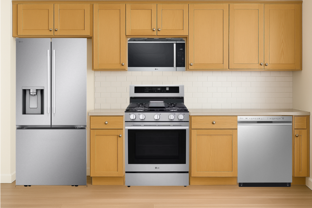 LG 4 Piece PrintProof Stainless Steel Kitchen Package with French Door Refrigerator, Slide-In Gas Range, Built In Dishwasher, and Over The Range Microwave.Read More