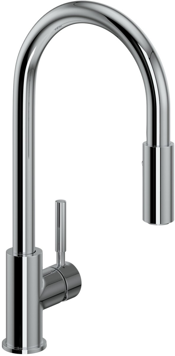 9 1/16” reach C-spout, retractable pull-down metal handspray