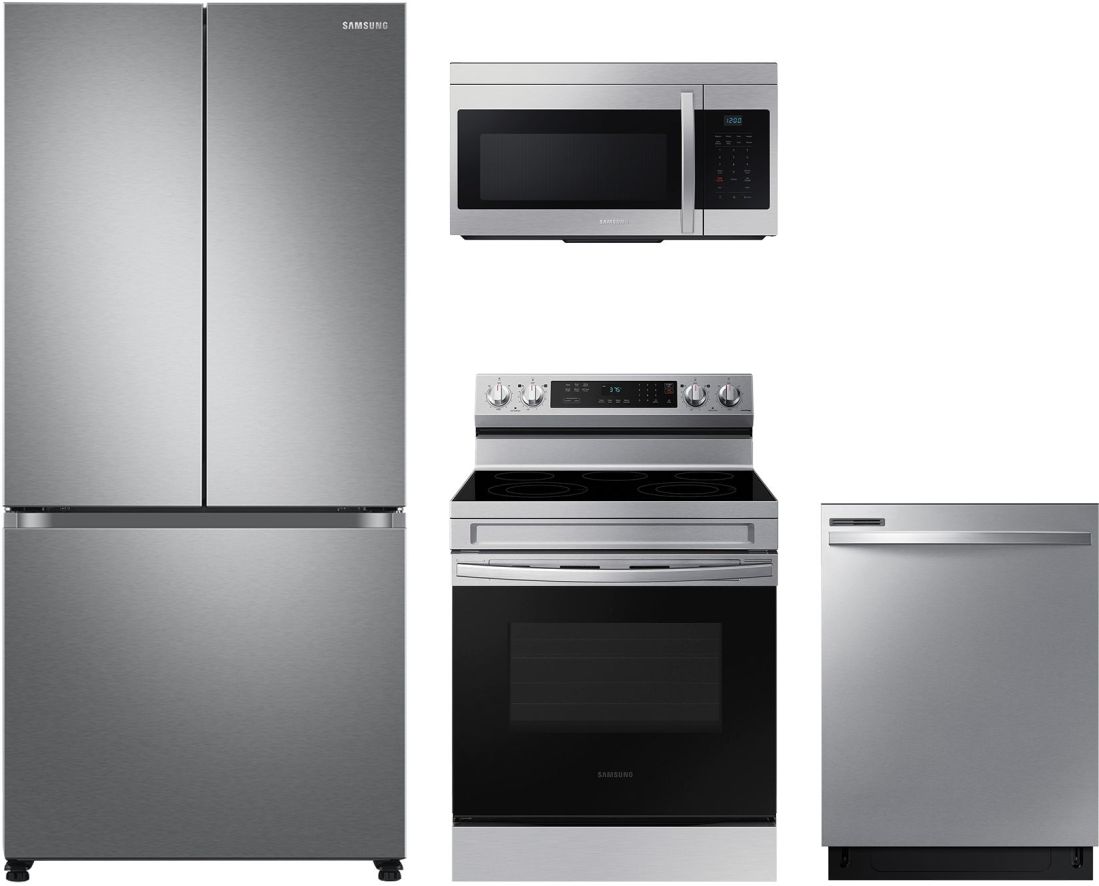 Samsung Stainless Steel Kitchen Package with a french door refrigerator, freestanding electric range, over the range microwave, and built in dishwasherRead More