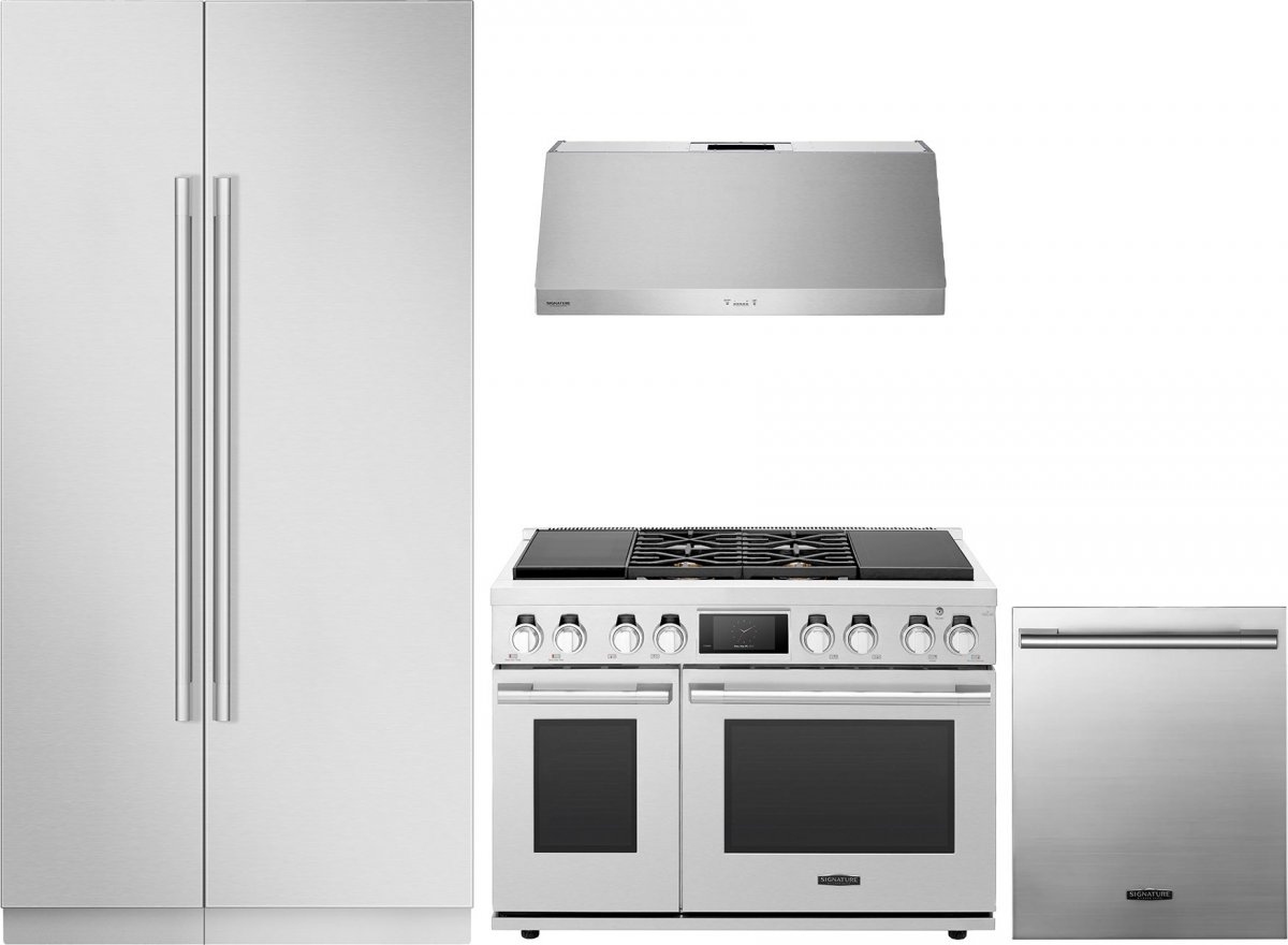 Signature Kitchen Suite 5 Piece Kitchen Package with all refrigerator, upright freezer, pro style dual fuel range, pro style wall hood and built in dishwasherRead More