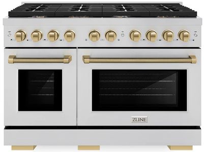 The ZLINE Autograph Edition 48 in. 6.7 cu. ft. Paramount Double Oven Dual Fuel Range with 8 Burner Gas Cooktop in Stainless Steel and Champagne Bronze Helix Handles and Knob Accents (SDRZ-48-KCB) combines the versatility of a gas cooktop with 8 Italian-made auto-reignition burners.Read More