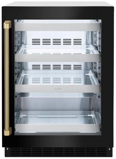 The ZLINE Autograph Edition 24 in. Touchstone 151 Can Beverage Fridge with Black Stainless Steel Glass Door and Polished Gold Helix Handle (RBSOZ-BS-24-KG) features an outdoor-compatible cooling system and an integrated black stainless steel glass door, giving you ultimate flexibility to host parties of any size.Read More