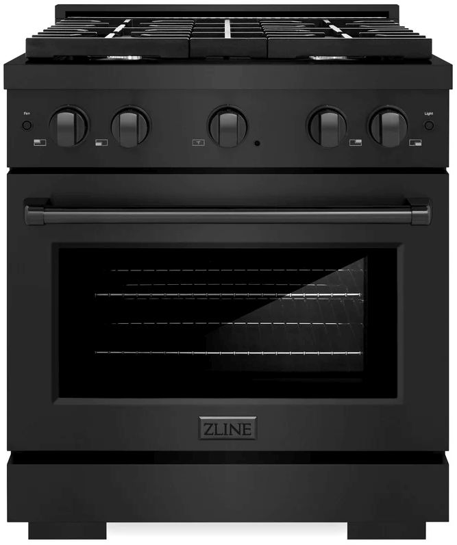 The ZLINE 30 in. 4.2 cu. ft. Paramount Dual Fuel Range with 4 Burner Gas Cooktop and Electric Convection Oven in Black Stainless Steel (SDRB-30) combines the versatility of a gas cooktop with 4 Italian-made auto-reignition burners, an electric convection oven with digital thermostat technology, enhanced cast iron grates, and a Horizon oven door window design allowing you to master every meal.