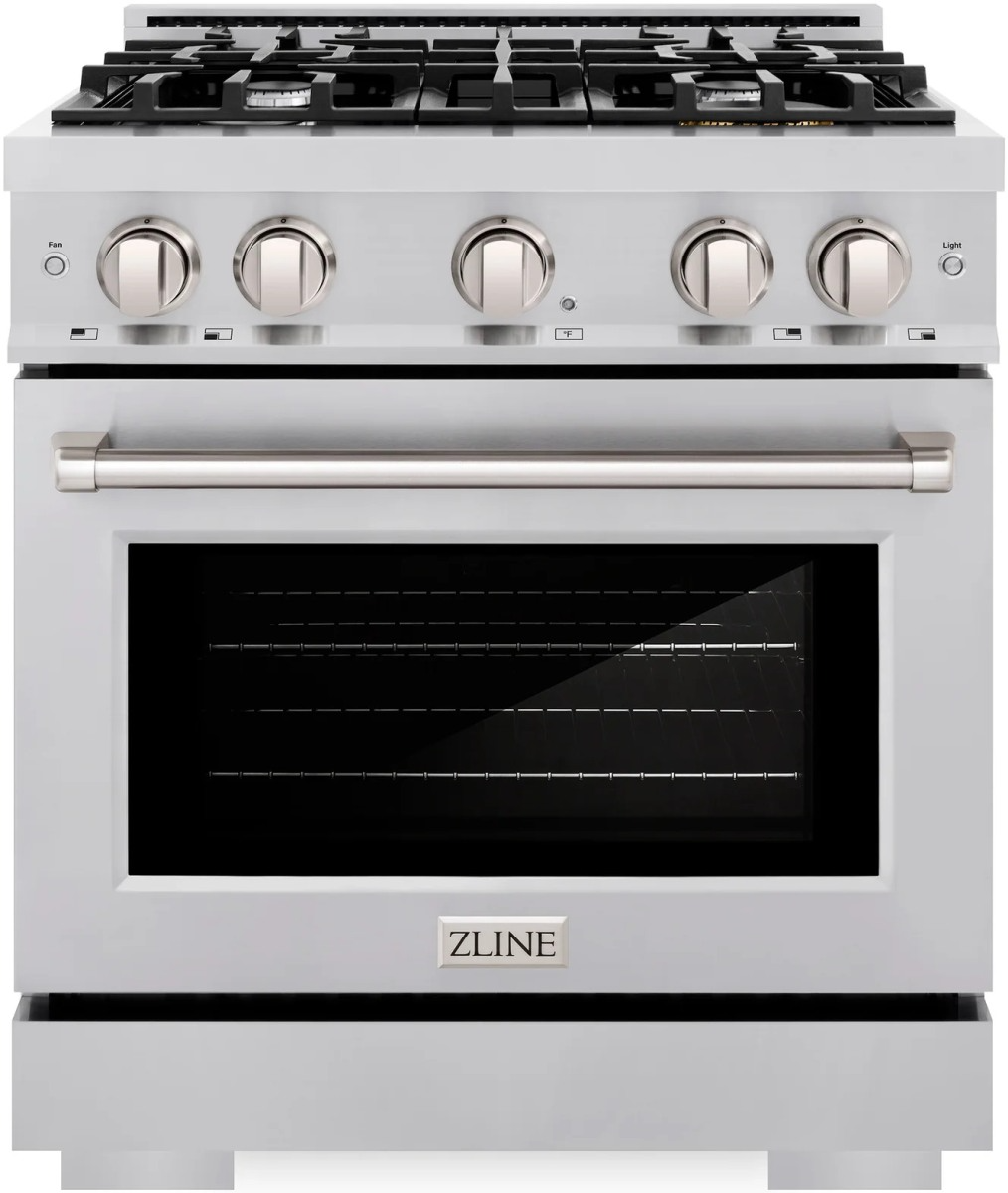 The ZLINE 30 in. 4.2 cu. ft. Select Gas Range with 4 Burner Cooktop and Convection Gas Oven in Satin Stainless Steel (HGRS-30) combines the elegance of a hand-finished porcelain gas cooktop with 4 Italian-made auto-reignition burners, a gas convection oven with an energy-efficient cooling fan to ensure quiet operation, and a Horizon oven door window design allowing you to master every meal.