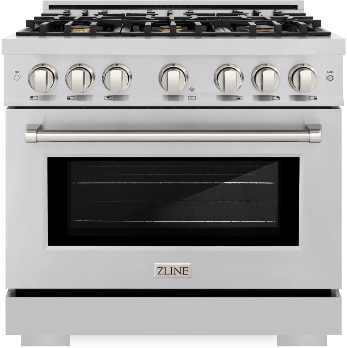 The ZLINE 36 in. 5.2 cu. ft. Select Dual Fuel Range with Gas Cooktop and Electric Convection Oven in Stainless Steel with 6 Brass Burners (HDR-BR-36) combines the elegance of a hand-finished porcelain gas cooktop with 6 Italian-made brass auto-reignition burners, an electric convection oven with an energy-efficient cooling fan to ensure quiet operation, and a Horizon oven door window design allowing you to master every meal.